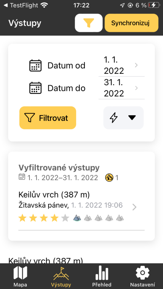 Mimo klasická filtrovací pole datum od a datum do je připraven i takový rychlý filtr. Je to ikonka s bleskem, která v sobě má v tuhle chvíli 4 možnosti. Jedním kliknutím se můžete podívat, kde jste byli na kopečku přesně před 1-3 lety. A pak také tlačítko na dnešní den. Je to stejný princip, který používá třeba Google nebo Facebook s fotkami. Jen my vám to zatím úplně necpeme a musíte si na to kliknout sami, abyste to viděli :-)