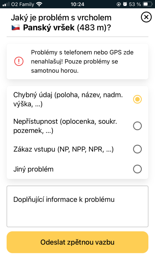 Puoi sicuramente aiutarci ricordandoci questo picco (coordinate del picco) inviando un'e-mail a info@horobrani.cz. La fonte di verifica per noi sono sempre i geoportali nazionali, per la Repubblica Ceca è solo il Geoportale della ČÚZK, che puoi trovare nell'applicazione con il nome Mappa Base. Passa a questo livello e poi potrai verificare se il picco soddisfa i requisiti di cui sopra. Puoi scoprire le coordinate tenendo il dito sulla mappa. Ti ringrazio in anticipo per il tuo aiuto.